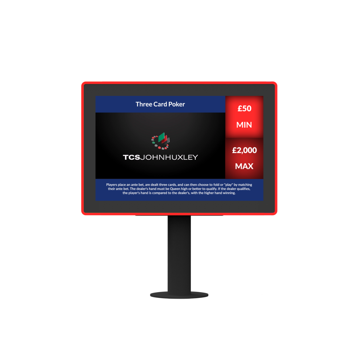 Table signage from TCSJOHNHUXLEY is the perfect way to compliment your gaming tables by clearly showing players the minimum and maximum table bets whilst showcasing promotions and marketing information. The Ora Limits Min Max Display offers a stylish and practical solution featuring a vibrant 10.1” touchscreen monitor and coloured LED frame.
